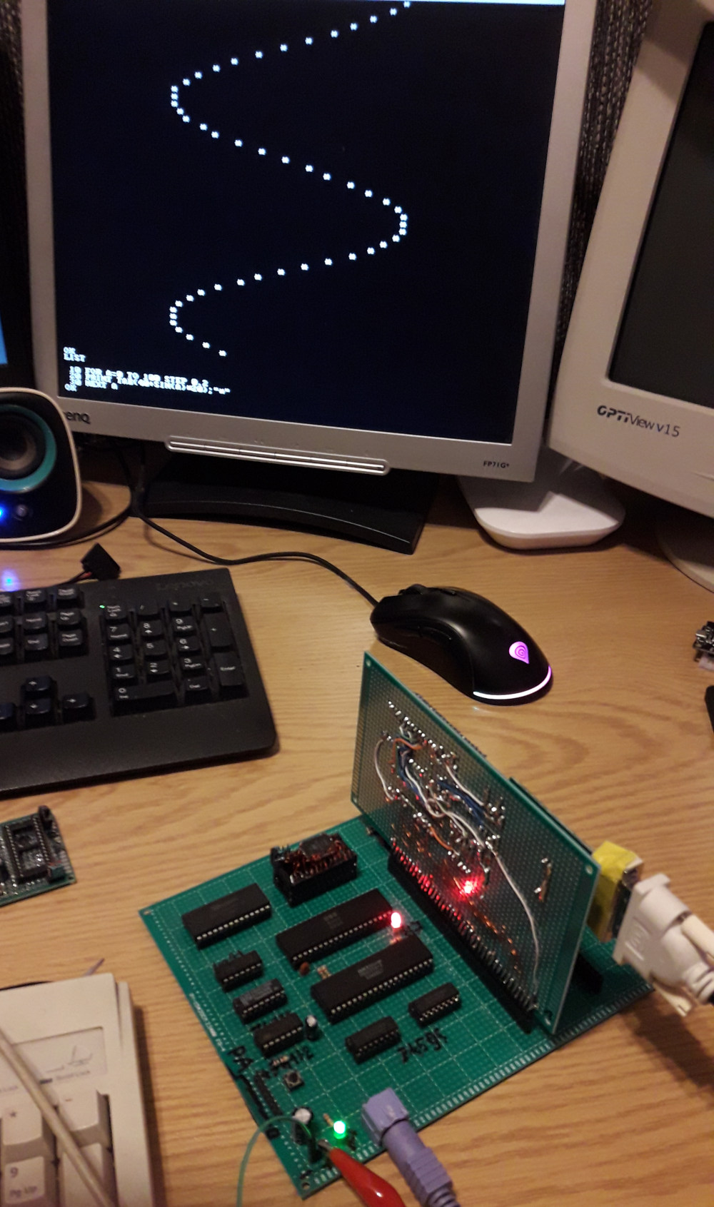 I think this one is more impressive. What's more classic than running BASIC on a 6502? I found this project on the internet: https://github.com/mist64/msbasic. It includes Microsoft BASIC and examples of how to port it. I remember there being two main routines that needed to be implemented: character printing and keyboard input. The first one was not very hard to implement. The graphics interface on my system is very basic - it's text mode graphics accessed by two registers implemented by the Raspberry Pi Pico. Implementing the keyboard input was harder. Actually, the keyboard controller on the prototype PCB version is the same as on the breadboard: when a key is pressed, an NMI interrupt is received and a PS/2 scan code is stored in a buffer accessible by the I/O chip. In the NMI interrupt handler, I had to read the PS/2 scan code from that buffer, decode it to an ASCII character (with shift key handling), and write the result to a circular buffer. The get character routine called by the BASIC checked the buffer and based on that, received the input. I could not find any videos showing this in action, but I found a screenshot (DVI screen capture) from when I was testing the sound card and a photo of a sample program printing on the screen.